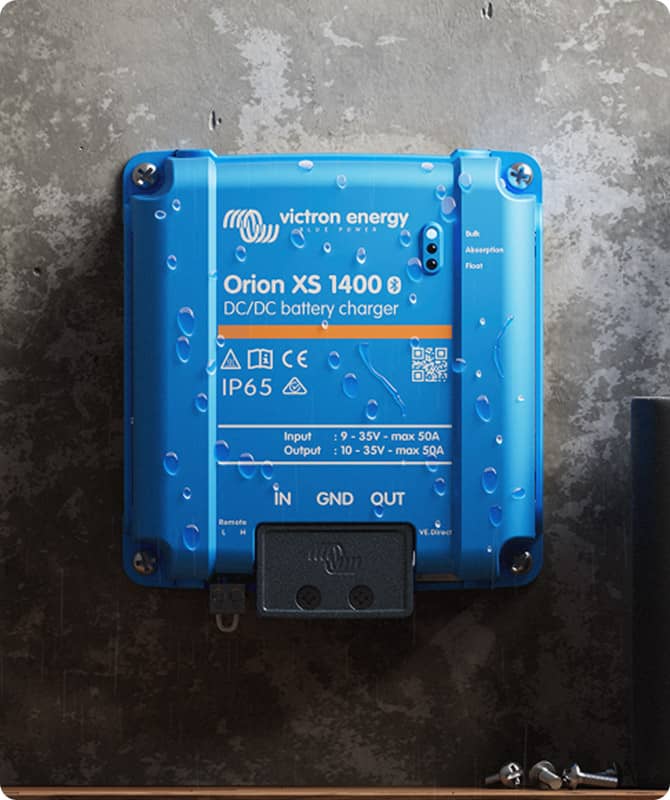 Resistente, compacto y sin ventilador, el Orion XS está hecho para la vida a bordo. Ofrece una carga CC-CC eficiente en compartimentos de motor estrechos, es compatible con varios bancos de baterías y ofrece conversión de 12/24 V con el modelo XS 1400.