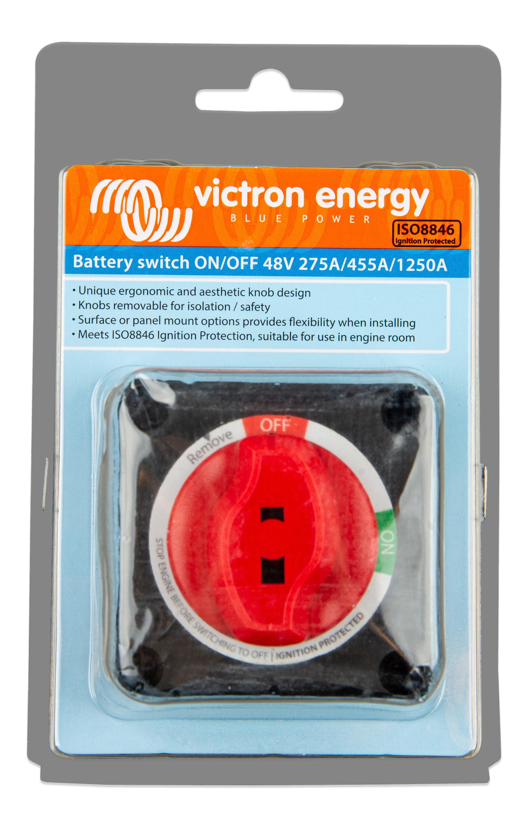 El interruptor de baterías Battery Switch ON/OFF 275A es adecuado para sistemas de baterías de hasta 48 V. El mando tiene un diseño ergonómico y estético único. Se puede retirar el mando para aislamiento o con fines de seguridad.