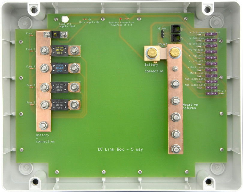 - 4 fusibles Mega (2x 300A, 1x 200A, 1x 100A) y 1 fusible Midi (60A) Estos son intercambiables según las necesidades del usuario. Los fusibles MEGA están disponibles en tamaños de entre 100 y 500 amp. y los MIDI entre 30 y 125 amps.
