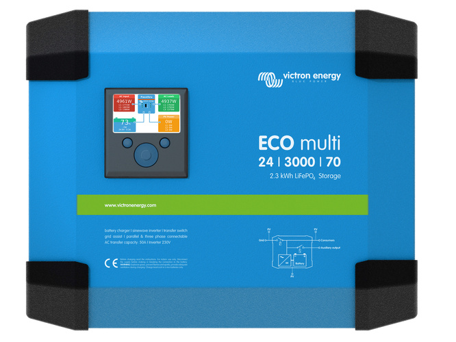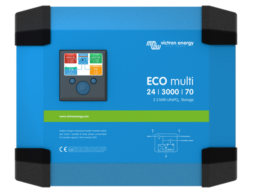 El ECOMulti puede montarse en una pared, es fácil de instalar, fácil de programar y fácil de manejar. Con una capacidad de almacenamiento de 2,3 kWh en baterías Li-Ion y con un inversor bidireccional de 3 kVA, el ECOMulti reduce la dependencia de la red eléctrica.