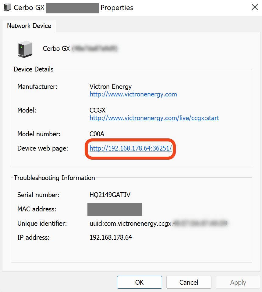 Numa rede local, por exemplo em casa, também pode encontrar o Color Control GX na vista geral «Rede» do Windows (utiliza a tecnologia de transmissão ligar e reproduzir universal (UPnP):