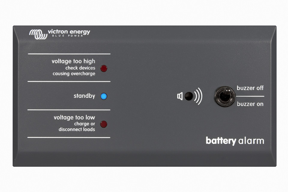 La alarma de batería es un pequeño panel de alarma de bajo coste que controla su bancada de baterías. Dispone tanto de alarmas acústicas como visuales, así como de un contacto sin tensión, con contacto normalmente abierto y normalmente cerrado. Los umbrales e histéresis de alarma se programan mediante interruptores DIP. Consulte el manual para más información.
