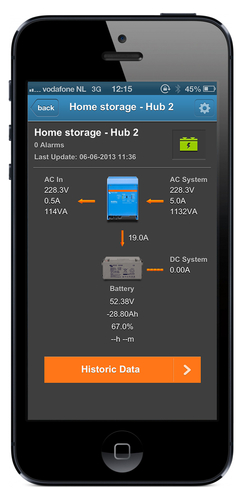 Con un solo toque, Color Control GX le muestra al instante una vista general de su sistema: estado de carga de la batería, consumo eléctrico actual, producción de energía de los paneles FV, energía proveniente de la red/generador.