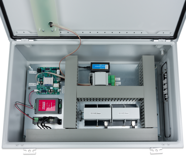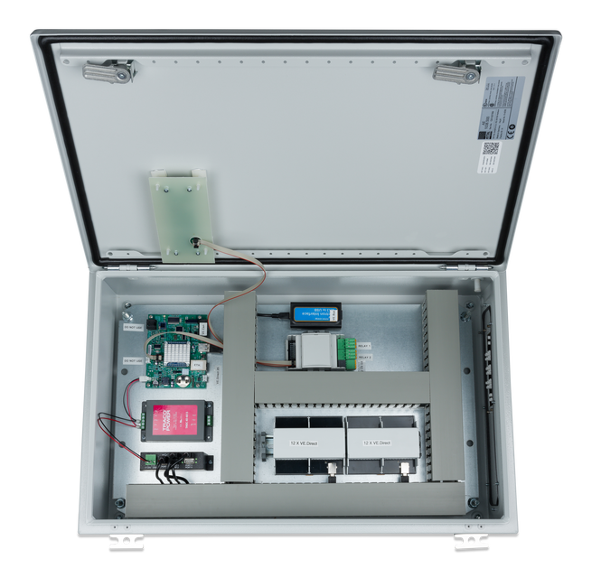 En comparación con los otros dispositivos GX, el Maxi GX es el que tiene mayor potencia de CPU y más puertos VE.Direct: 25. Este es un dispositivo GX para usar en grandes sistemas con muchos cargadores solares MPPT VE.Direct.