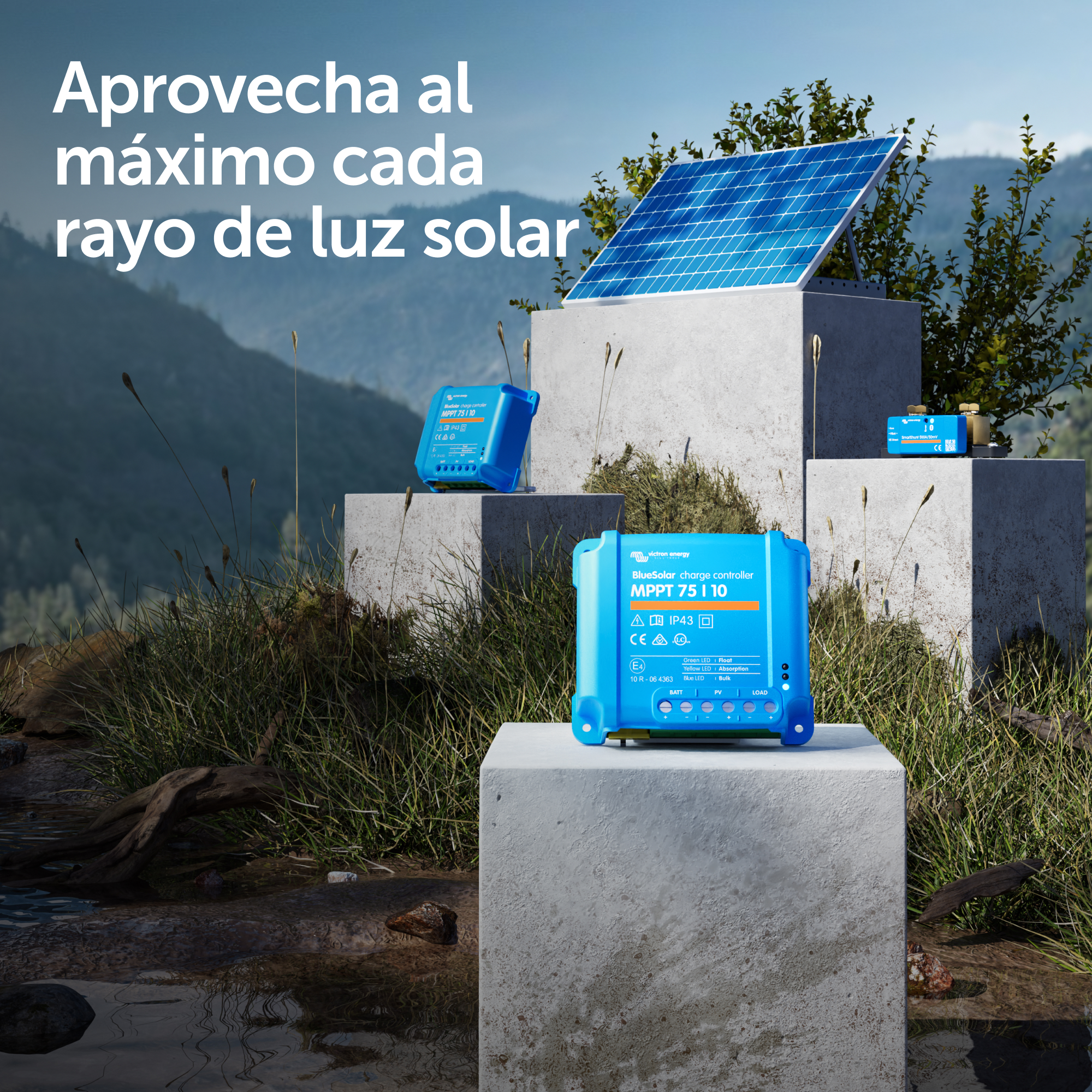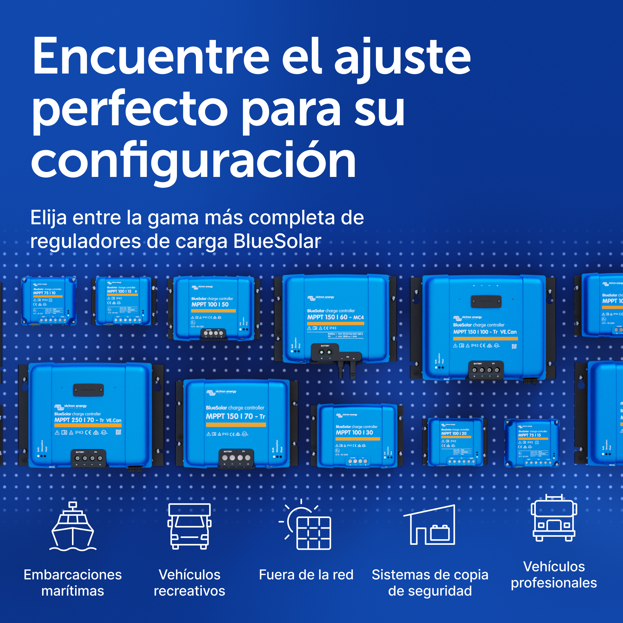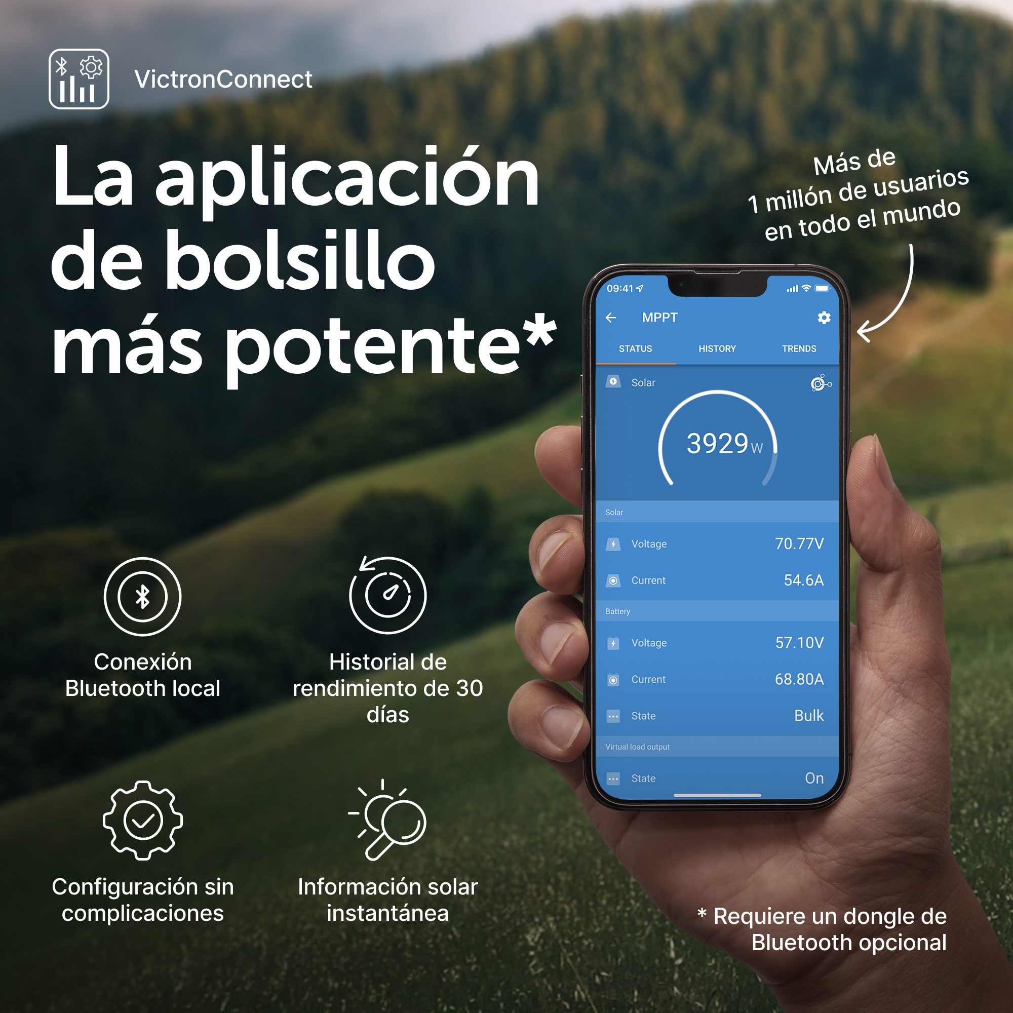 Realice el seguimiento y control a distancia de la multitud de opciones de su cargador MPPT BlueSolar conectándole una mochila Bluetooth y emparejándolo con su smartphone u otro dispositivo mediante VictronConnect. Si su instalación está conectada a Internet a través de un dispositivo GX, el Portal de Gestión Remota de Victron (VRM) le proporcionará acceso a toda la potencia de su MPPT, en cualquier momento y en cualquier lugar; tanto VictronConnect como el VRM son gratuitos. En el caso de instalaciones remotas, aun cuando no haya conexión a Internet disponible, podrá monitorizar su MPPT conectando el GlobalLink 520.