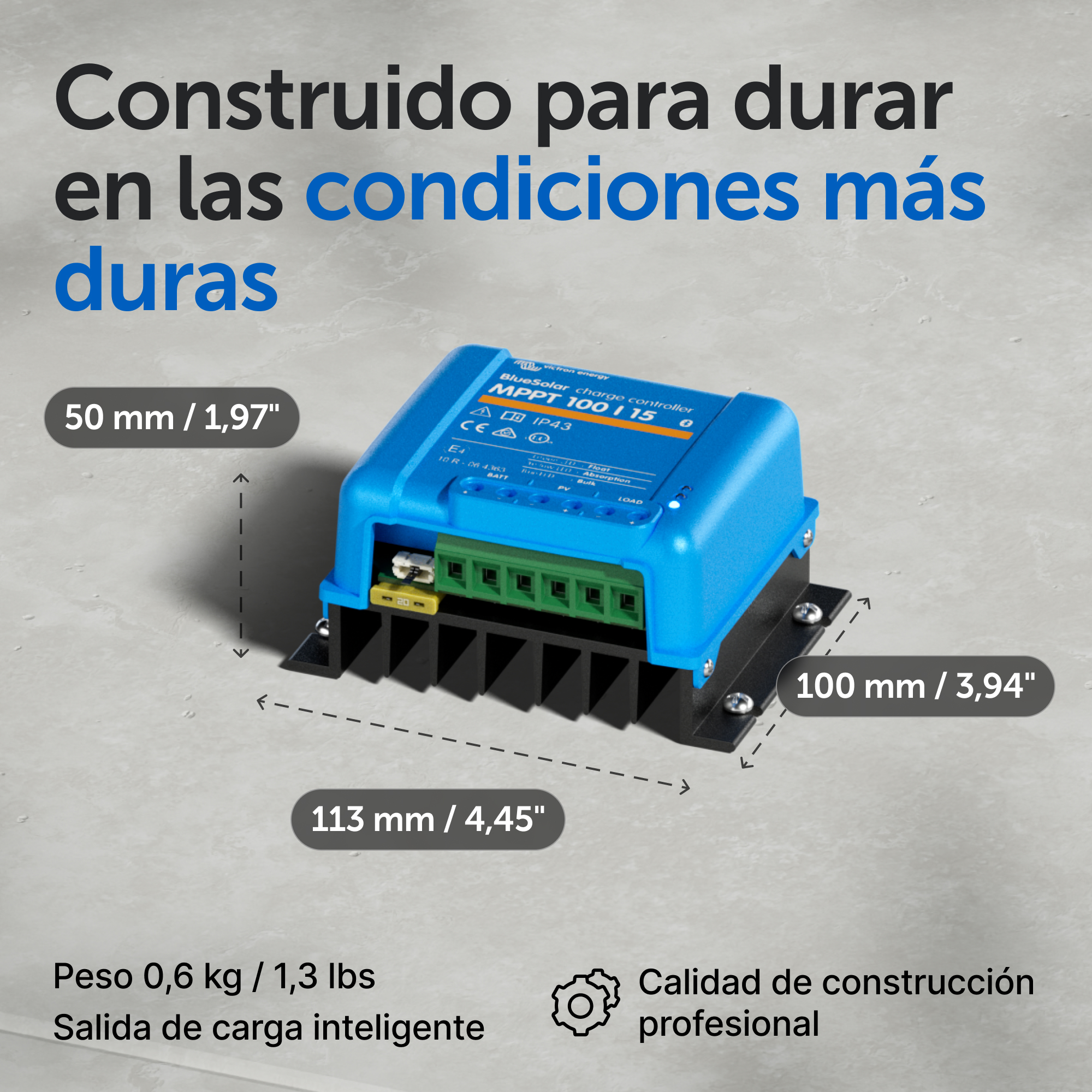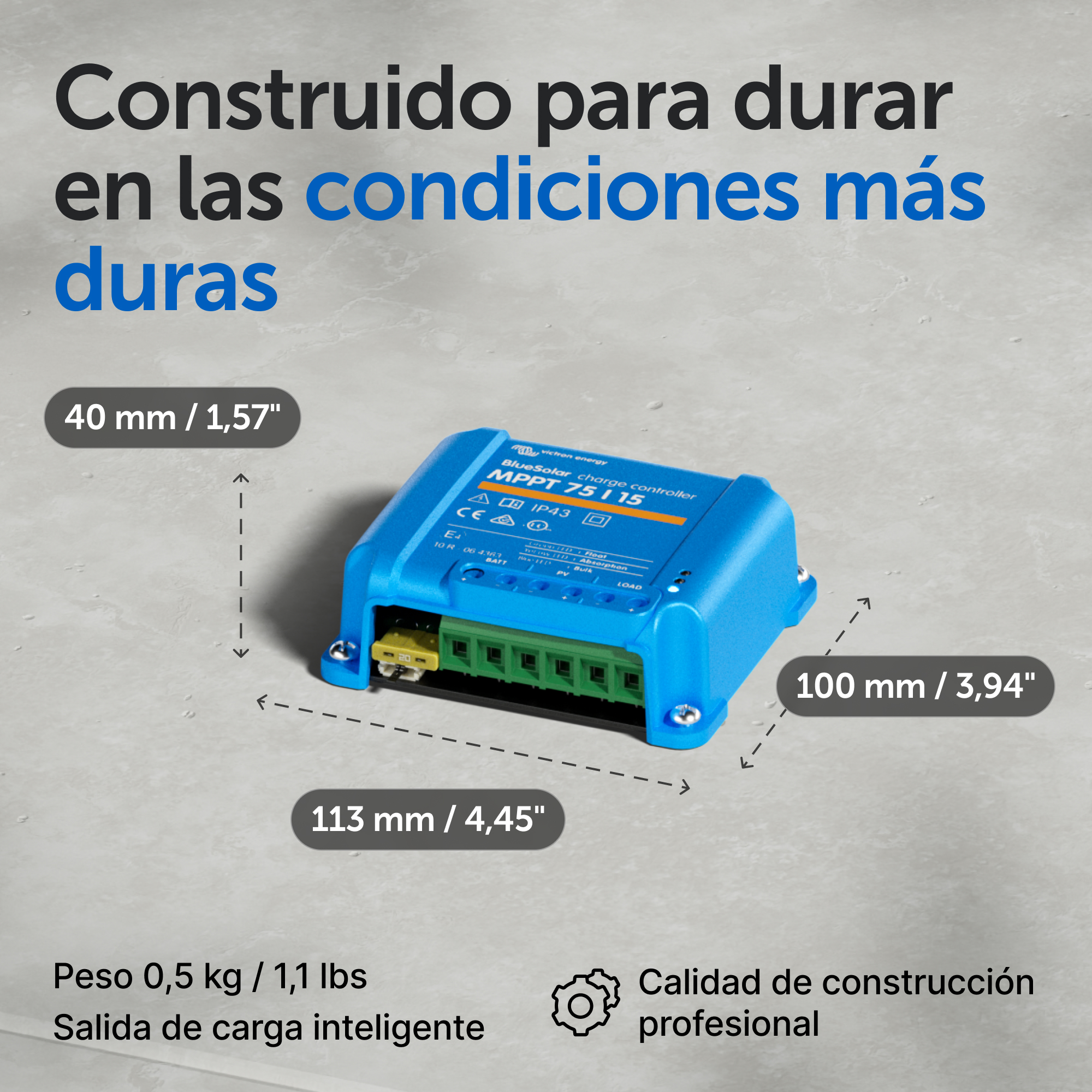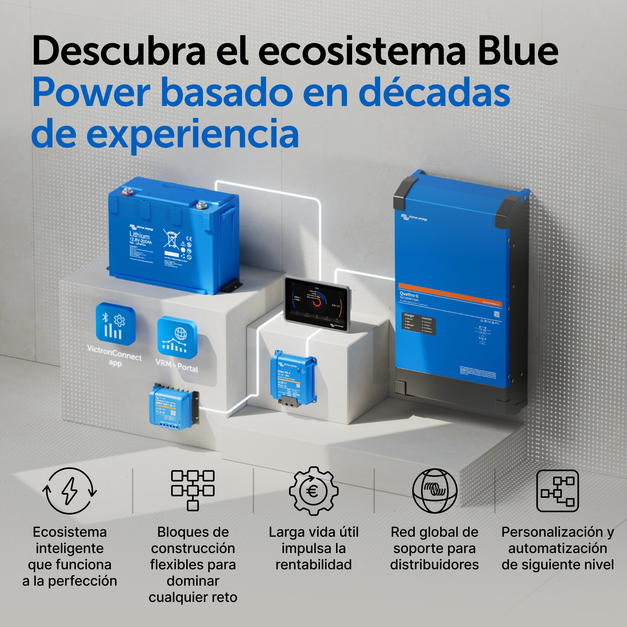 Realice el seguimiento y control a distancia de la multitud de opciones de su cargador MPPT BlueSolar conectándole una mochila Bluetooth y emparejándolo con su smartphone u otro dispositivo mediante VictronConnect. Si su instalación está conectada a Internet a través de un dispositivo GX, el Portal de Gestión Remota de Victron (VRM) le proporcionará acceso a toda la potencia de su MPPT, en cualquier momento y en cualquier lugar; tanto VictronConnect como el VRM son gratuitos. En el caso de instalaciones remotas, aun cuando no haya conexión a Internet disponible, podrá monitorizar su MPPT conectando el GlobalLink 520.
