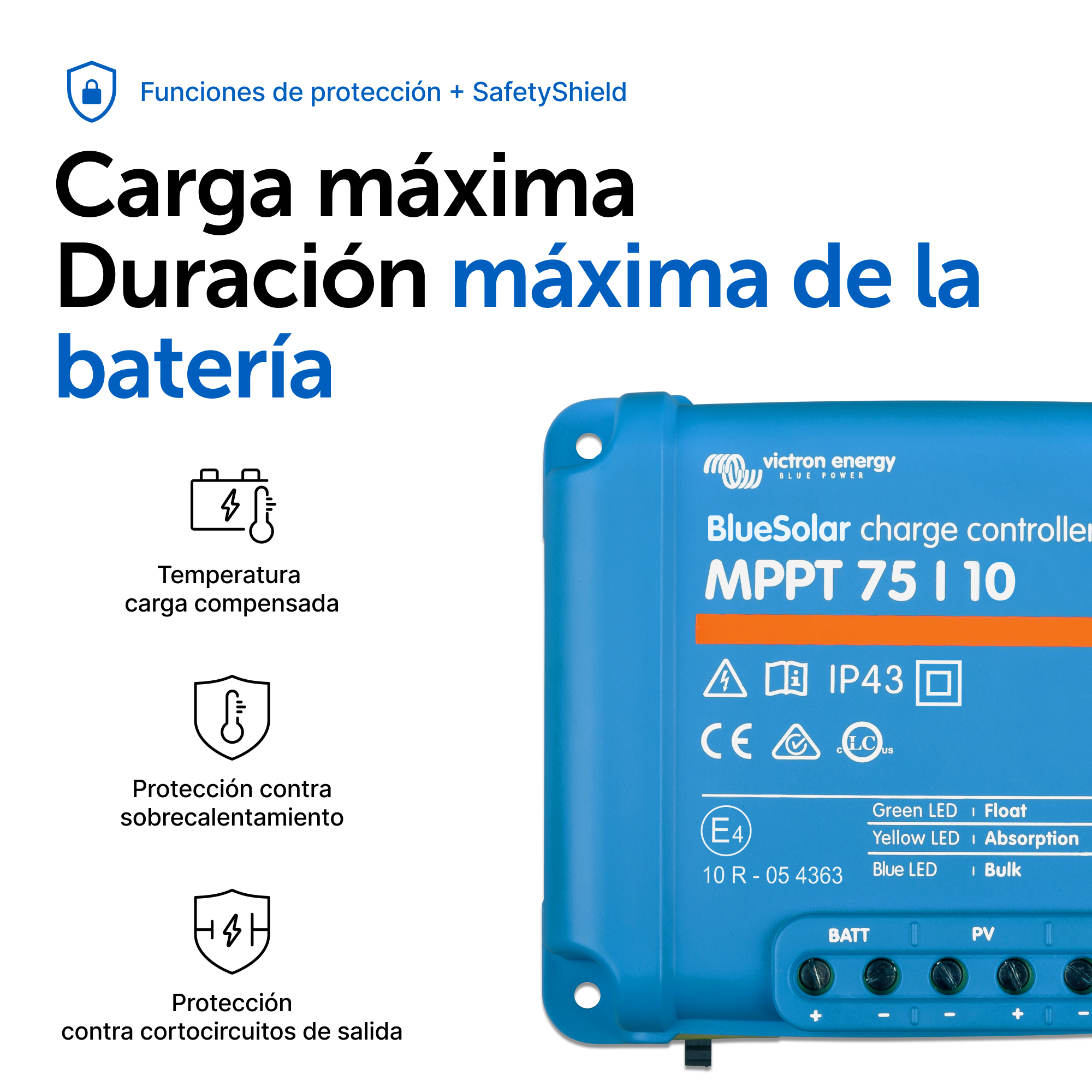 La función inteligente Salida de carga evita los daños que se producen cuando una batería se queda «vacía». Se puede configurar la tensión a la que el BlueSolar debe desconectar la carga, evitando así un drenaje excesivo de sus baterías. Y aquí está el truco ingenioso: BlueSolar intentará recargar la batería al 100% todos los días. Si no pudiera hacerlo, como en caso de periodos de mal tiempo, elevará la tensión de desconexión diariamente hasta que lo consiga. A esta característica la llamamos BatteryLife, porque mantiene la salud de su batería y amplia su vida útil.