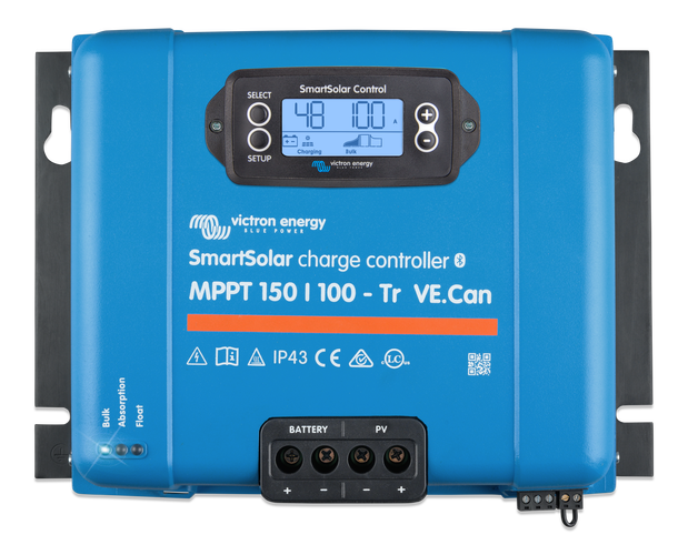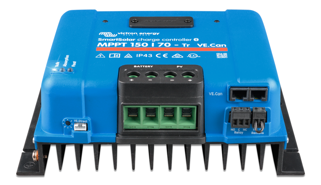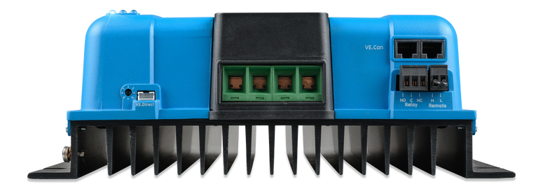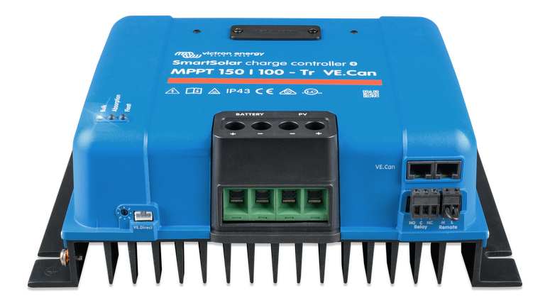 El cargador solar SmartSolar MPPT VE.Can se conecta a un conjunto FV de 150 o 250 Voltios Voc y detecta y carga automáticamente su banco de baterías de 12, 24 o 48 V con una corriente de entre 70 y 100 A según el modelo.