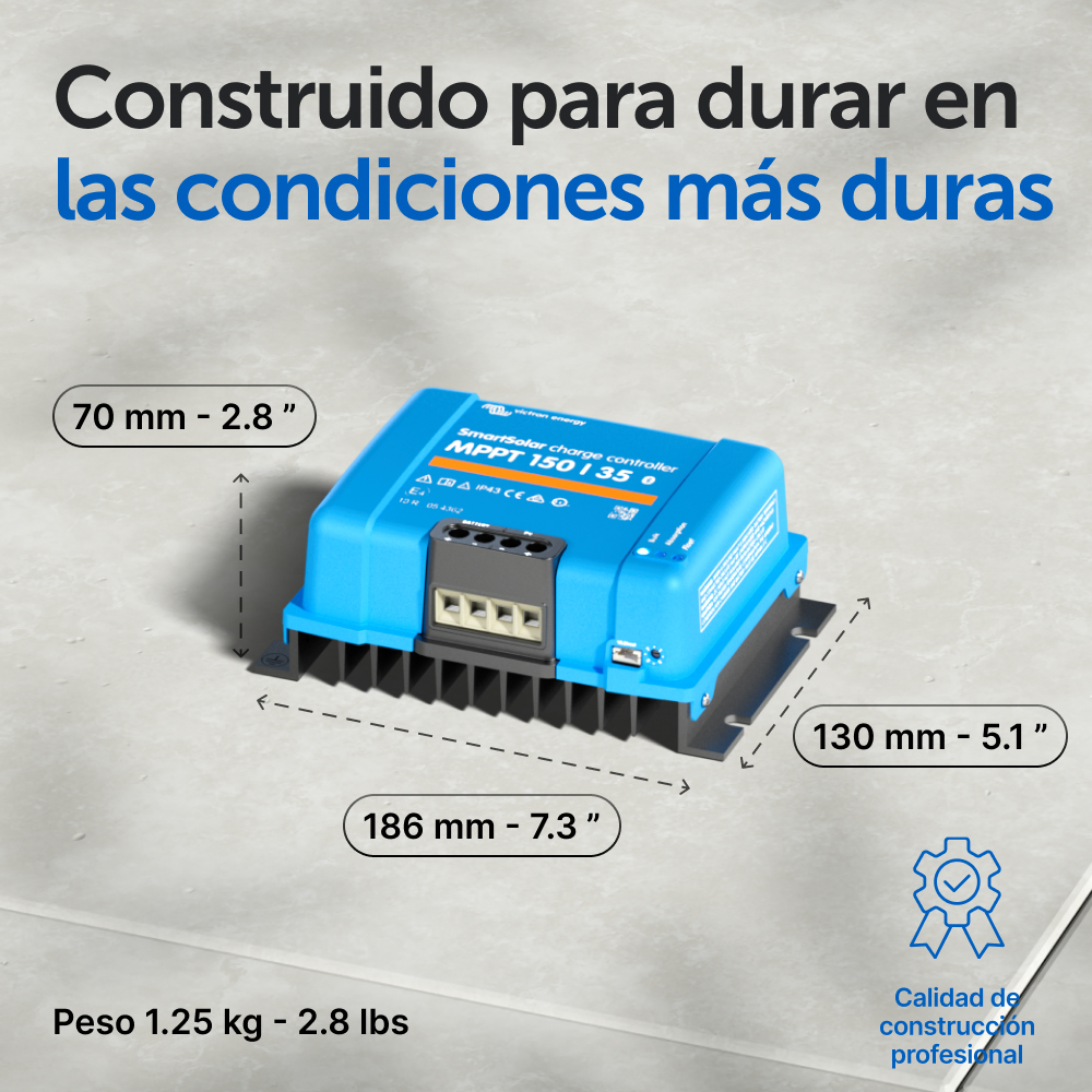 El SmartSolar MPPT prioriza el cuidado de la batería con las funciones SafetyShield+ integradas, basadas en décadas de experiencia en baterías. Entre ellas se incluyen la carga con compensación de temperatura, la protección contra sobretemperatura y la protección contra cortocircuitos fotovoltaicos, polaridad inversa y corriente inversa.
